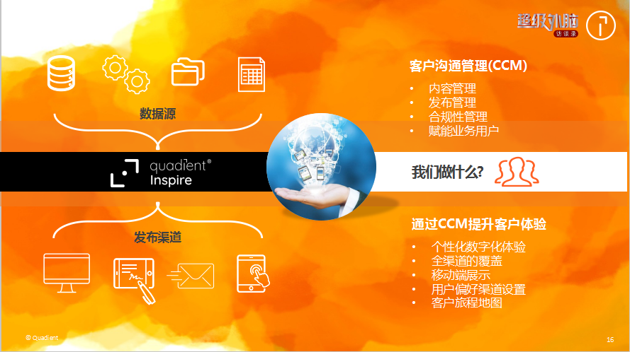 从Quadient我们企业自己本身来讲的话呢,我们做的更多的是CCM客户沟通管理了,因为客户沟通管理其实本身是这个客户体验管理当中非常重要的一个环节。无论是市场或者是消费者也总是在变化,所以为了不落后,我们企业也需要变化。对于企业来讲比方说市场来了一个热点,我们其实可以为客户提供的一个服务就是能把这些共性的工作通过平台统一代码的形式呢让它快速的生成,我们就是在创造一些更多的个性化、创意性的内容。从这个成本、时间的角度,包括从效率和受益的角度,都会给企业带来非常大的意义,那这个就是我们其实在做这个CCM客户体验管理这一块比较典型的一个案例。